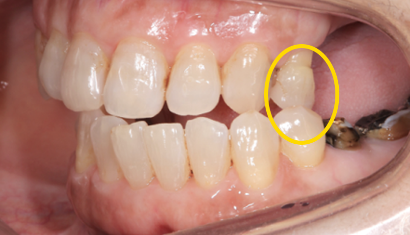 この歯(黄色の印)は顎を横に動かした時に強い力が加わり、歯の周囲の組織にダメージが出ているため、力をコントロールするために歯の形を修正が必要です。